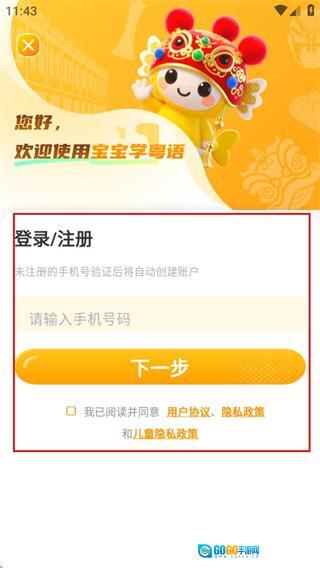 3、在登录页面,填写手机号码并勾选协议后,点击下一步按钮即可继续注册流程。