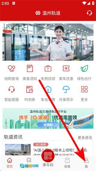 1、在温州轨道页面,点击底部我的,进入个人页面。