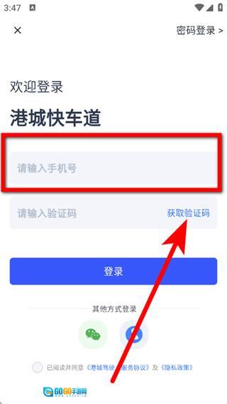 3、在登录界面,输入手机号,点击获取验证码。