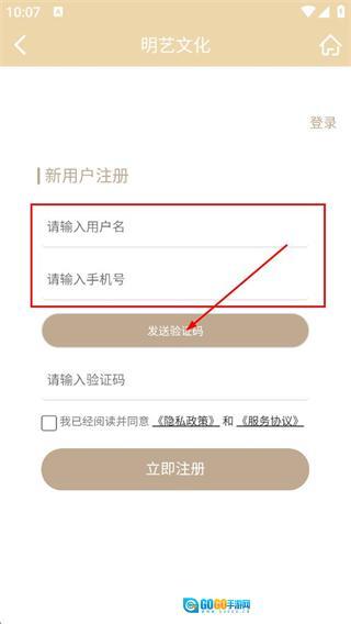 3、进入新用户注册界面后,依次填写用户名与手机号,接着点击发送验证码按钮。