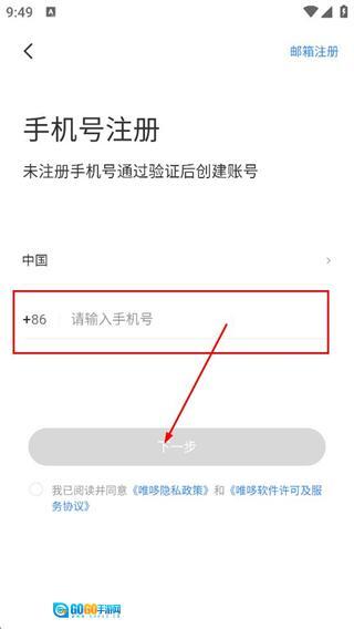 3、在手机号注册页面,填写手机号,勾选同意相关协议后,点击下一步按钮。