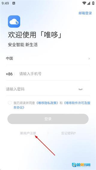 2、在唯哆登录页面,点击新用户注册选项,进入手机号注册页面。