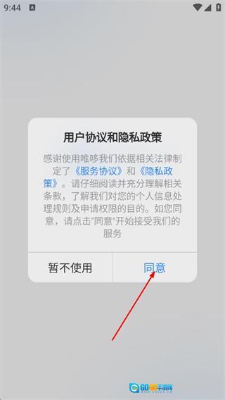 1、阅读服务协议和隐私政策后,点击同意,进入唯哆登录页面。