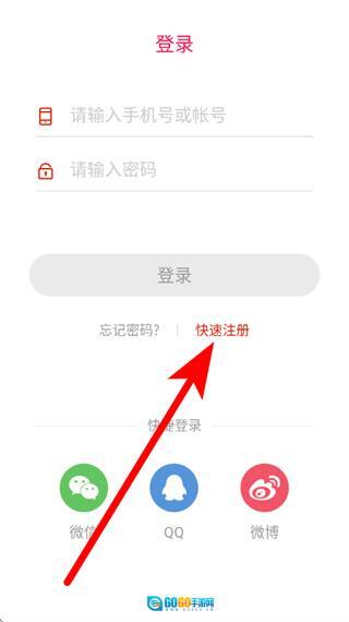 3、在登录页面,点击快速注册,进入快速注册页面。