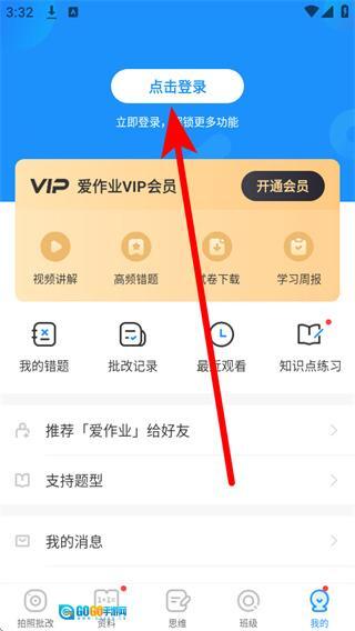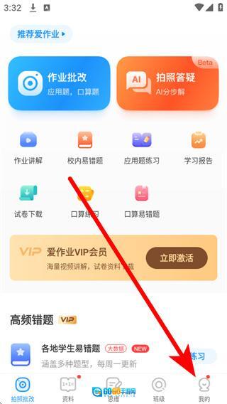 1、打开爱作业应用,进入首页后,点击底部导航栏中的“我的”选项,即可进入个人中心页面。