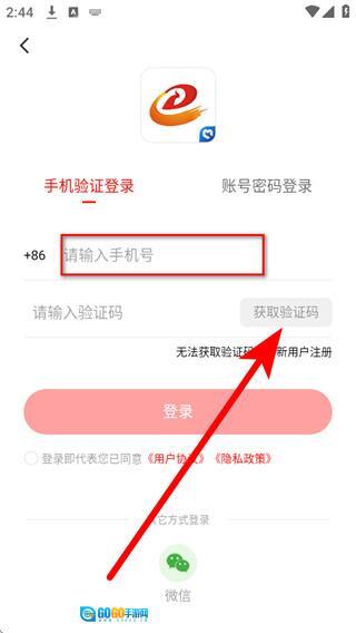 3、进入登录页面后,填写“请输入手机号”对应的输入框,然后点击“获取验证码”按钮。