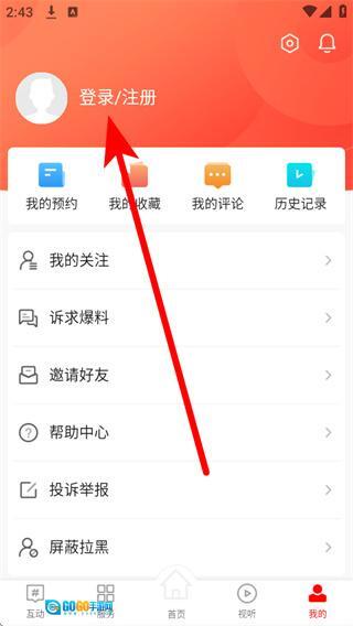 2、在个人中心页面找到登录注册区域并点击,即可进入账号登录页面。