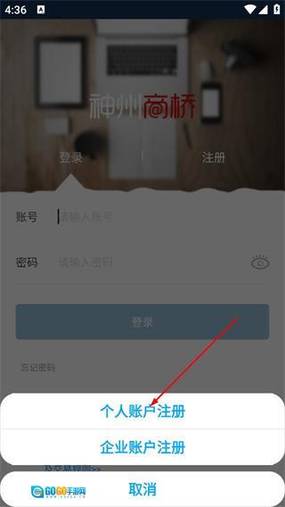 3、在注册界面弹出的选项中,点击个人账户注册,进入个人注册流程。
