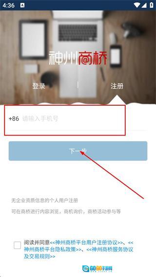 4、在个人注册页面,填写手机号,勾选相关协议后,点击下一步按钮。