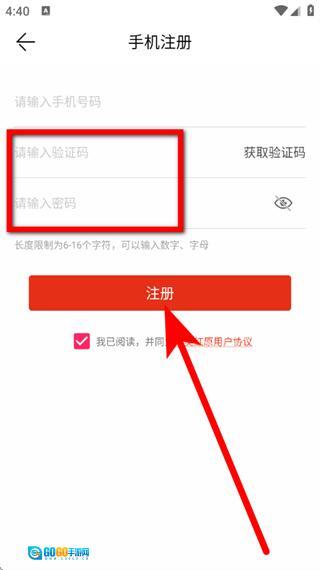 5、输入验证码,设置密码,确认已勾选相关协议后,点击注册,完成账号注册。