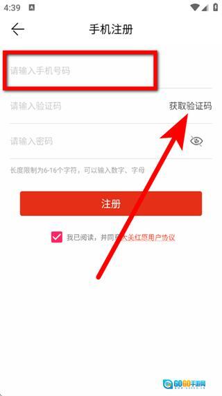 4、在手机注册页面,输入手机号码,点击获取验证码。