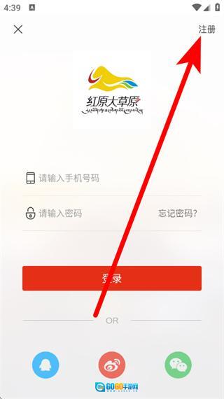 3、在登录页面,点击右上角的注册,进入手机注册页面。