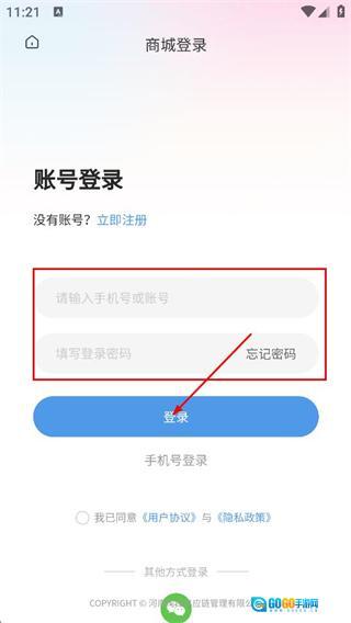 3、在商城登录页面,点击账号登录选项,切换至账号登录的操作界面。