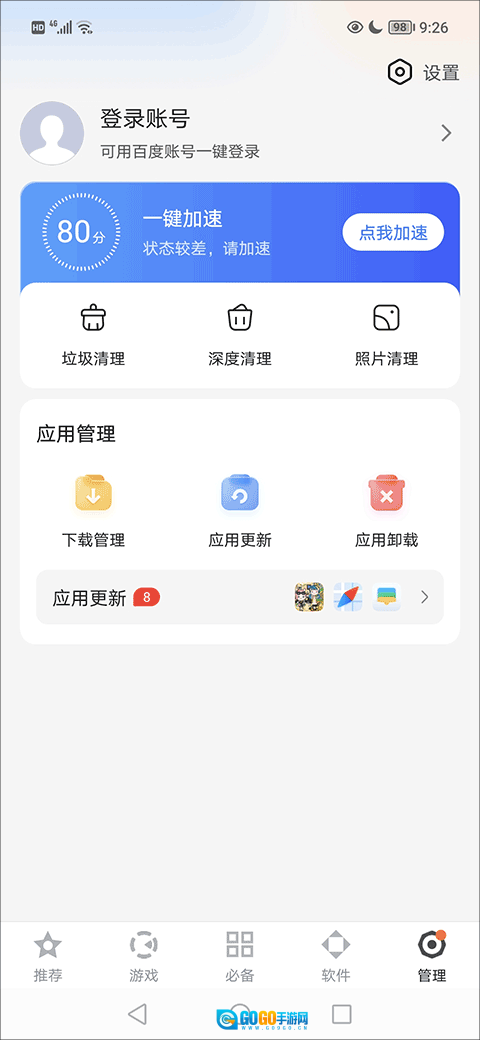 1、打开百度手机助手,进入“管理”页面,找到“设置”按钮。