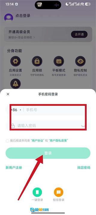 4、在手机密码登录页面的填写账号密码,点击登录,即可完成账号密码的登录操作。