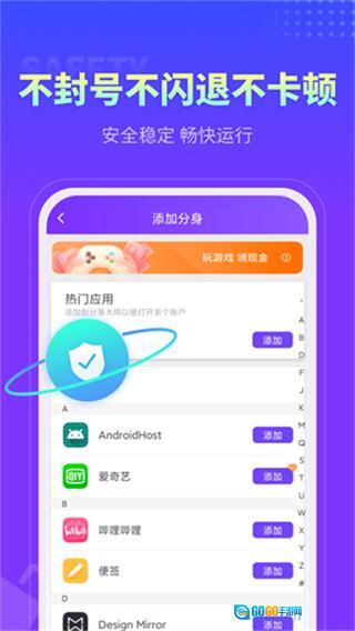 3、游戏玩家专属利器,支持游戏应用无限分身,支持游戏分身数据单独备份,防止游戏进度丢失,专属功能让游戏玩家告别多设备操作的繁琐,重新定义移动游戏多账号使用方式。