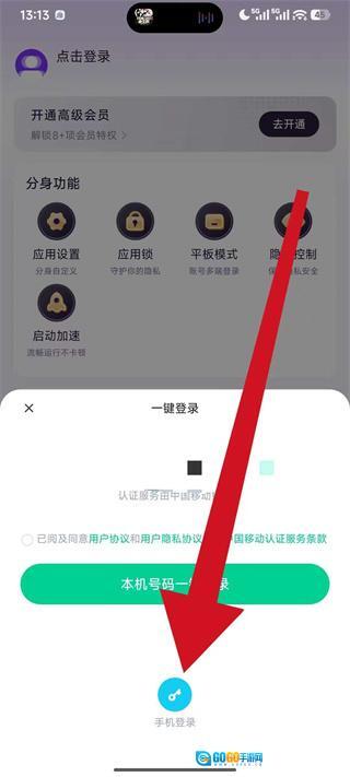 3、弹出一键登录选择框后,点击手机登录,进入手机密码登录页面。