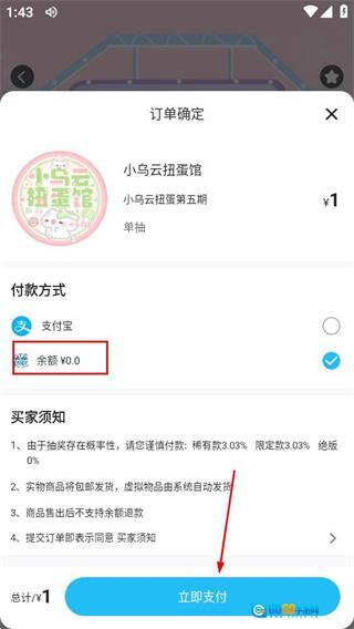 4、在订单确认页面选好付款方式,走完支付流程就能进行扭蛋操作了。