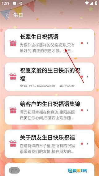 进入首页后,点击“生日祝福”选项,即可进入生日祝福语的分类页面。