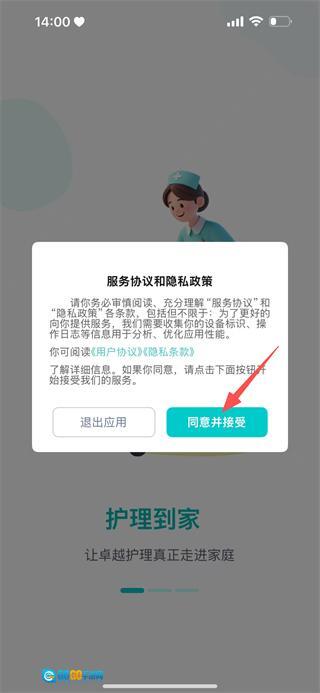 1、阅读用户协议和隐私条款后,点击同意并接受,进入护理到家的首页。