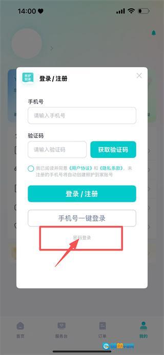2、在护理到家的首页,点击底部的我的选项,触发登录/注册的弹窗页面。