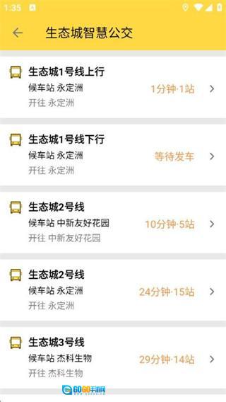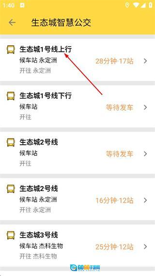 2、在公交页面,点击生态城1号线上行对应的条目,进入该线路的详情页面。