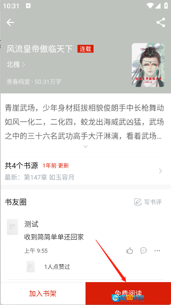 5、用户找到并点击心仪的小说资源后,进入详情页并点击“免费阅读”按钮。