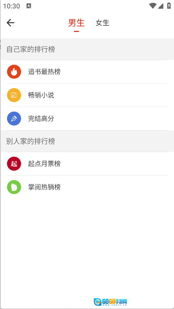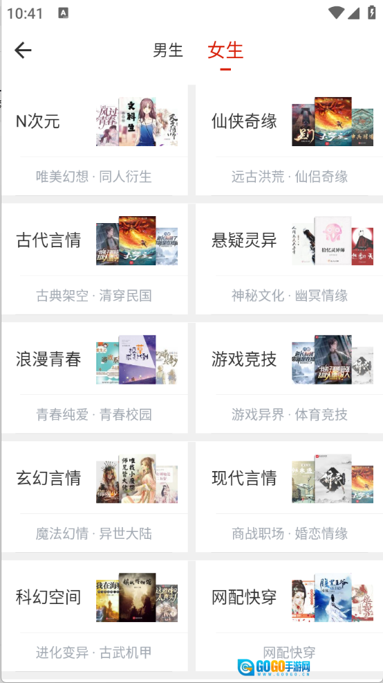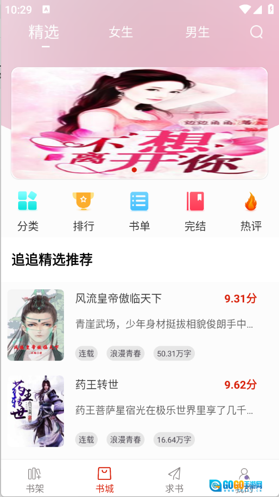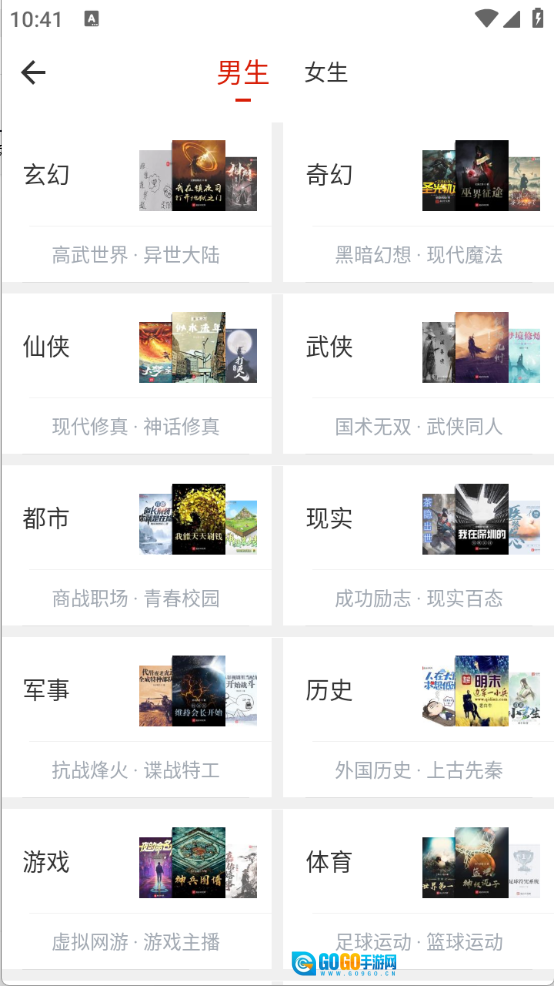 2、“书城”页面把小说做了细致的分类,涵盖男生、女生等不同类别。