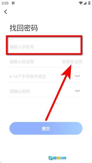 4、在找回密码页面,输入手机号,点击获取验证码。