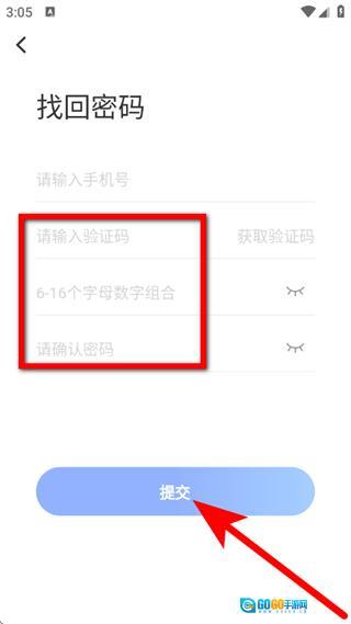 5、输入验证码,设置新密码,点击提交,完成密码找回。