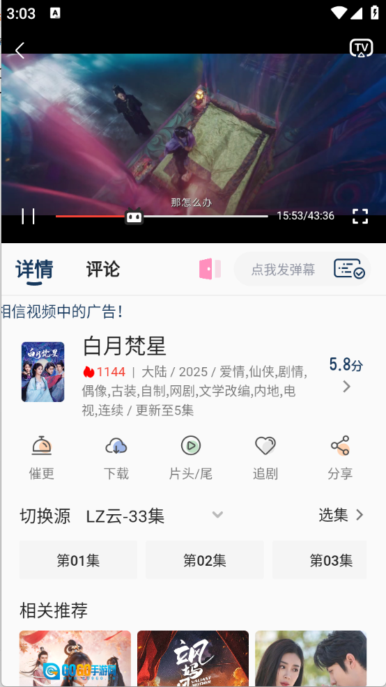 6、打开想要观看的影片后,能够查看弹幕、选择集数以及切换播放源等。