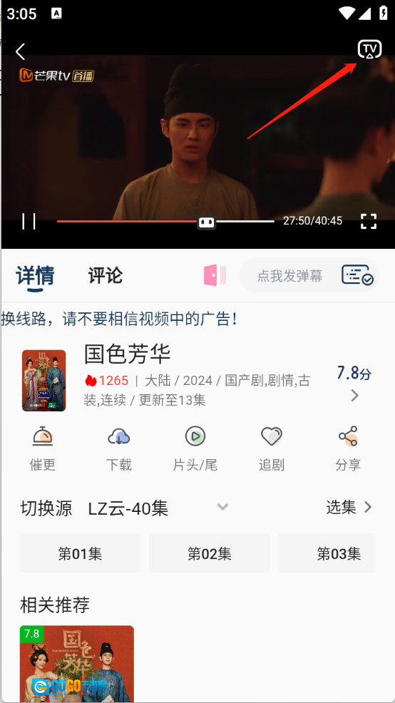 1、用户打开想看的影视之后点击右上角的“TV”。