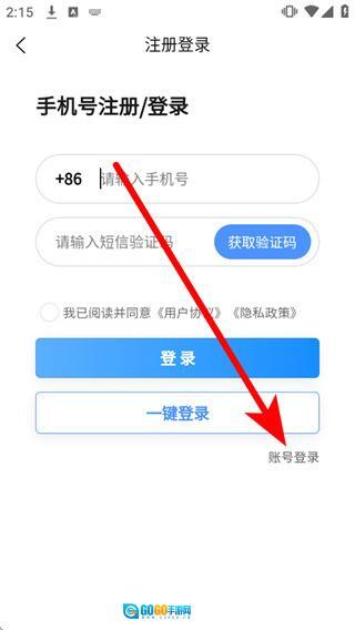3、在注册登录页面点击下方的账号登录,切换至账号密码登录界面。