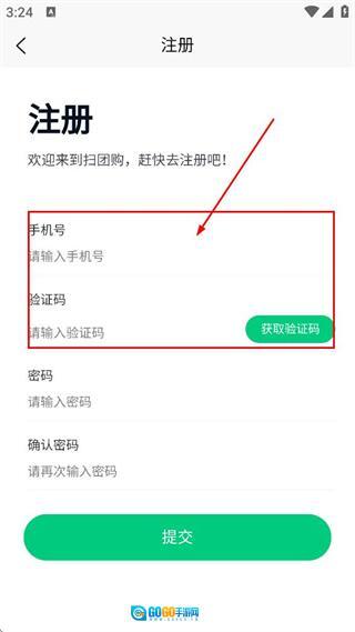 4、在注册页面,填写手机号,获取验证码后,填写对应的验证码。