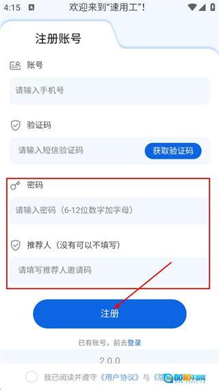 3、在注册账号页面,填写密码,选填推荐人邀请码后,点击注册按钮完成注册操作。