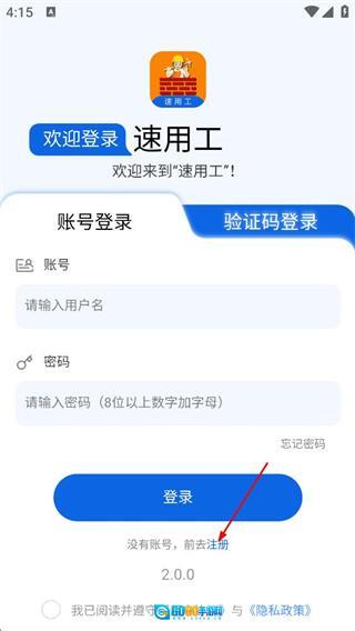 1、在速用工的登录页面,点击没有账号,前去注册选项,进入注册账号页面。