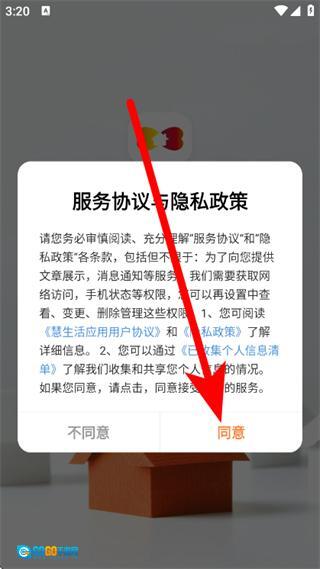 1、打开新长宁慧生活应用,当出现服务协议与隐私政策的弹窗时,点击“同意”按钮。