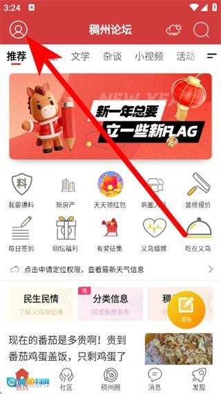 1、在义乌稠州论坛首页,点击左上角的个人图标,进入我的页面。