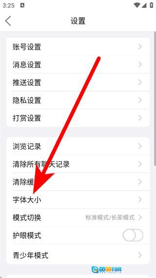 3、在设置页面,点击选择字体大小,进入字体大小设置页面。