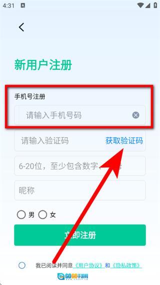 3、在注册页面,输入手机号码,点击获取验证码。