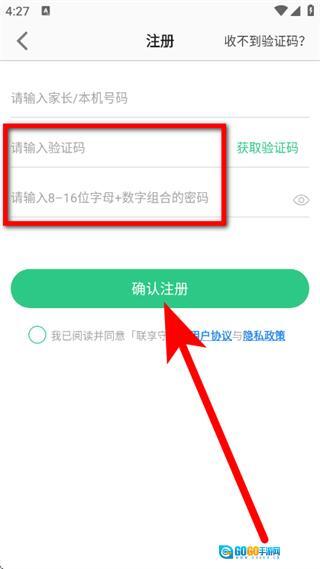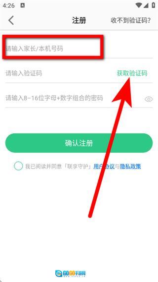 3、在注册页面,输入家长与本机号码,点击获取验证码。