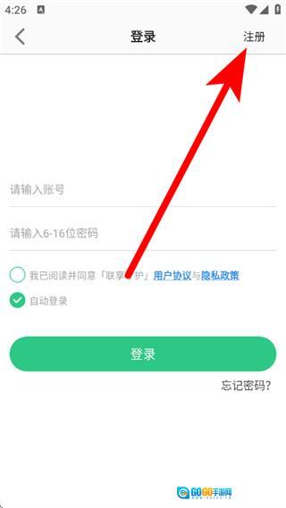 2、在账号登录界面,点击顶部的注册,进入注册页面。