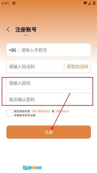 3、在注册账号页面,填写密码和确认密码,点击注册按钮,完成注册操作。