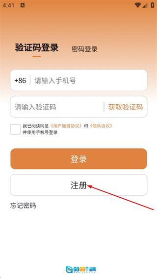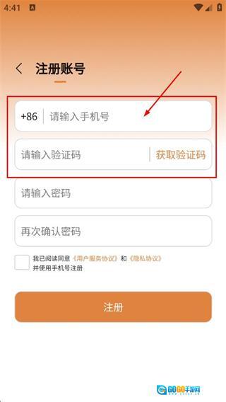 2、在注册账号页面,填写手机号,点击获取验证码后,填写对应的验证码。