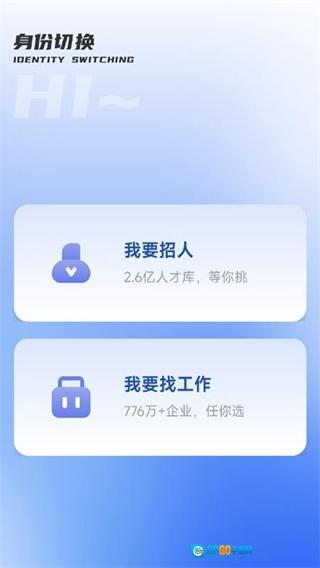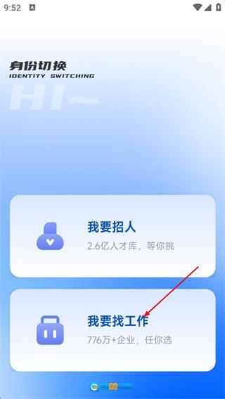 1、在身份切换页面,点击我要找工作选项,进入招聘求职的登录选择页面。