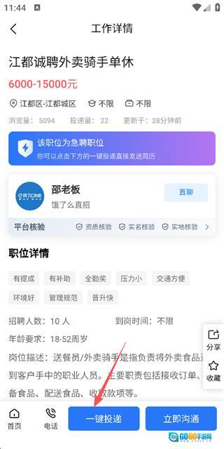 3、在工作详情页面点击一键投递按钮,完成该职位的简历投递操作。