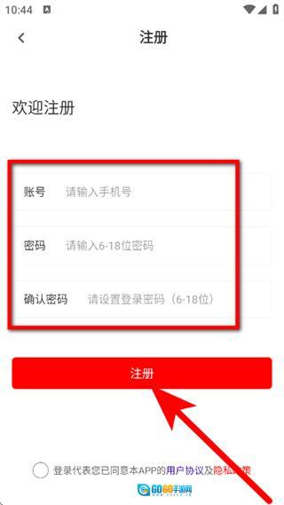 4、进入注册页面后,先填写手机号,接着设置好密码,再点击注册按钮,即可完成账号的注册流程。