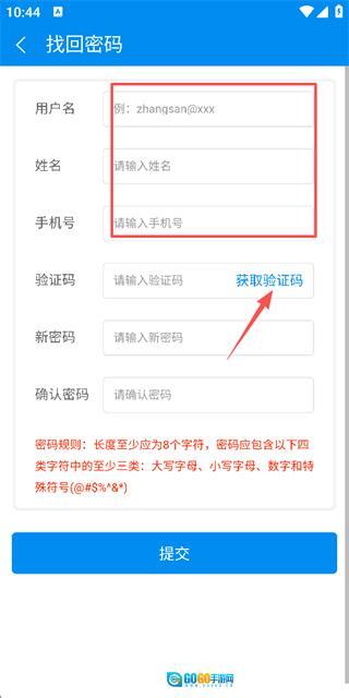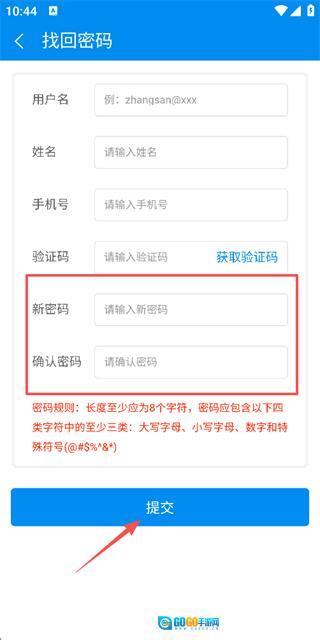 3、在找回密码页面填写新密码与确认密码后,点击提交按钮完成密码重置操作。