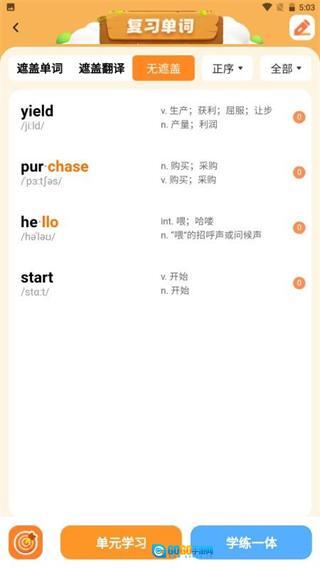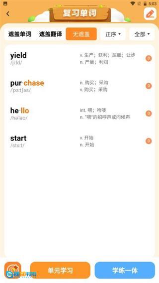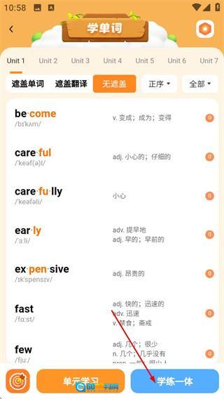 2、在单词学习页面,点击学练一体按钮,可进入该单元的学练一体页面。
