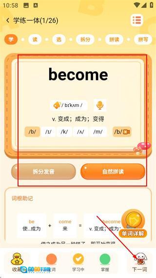 3、在学练一体页面完成当前单词学习后,点击下一词按钮可继续学习下一个单词。